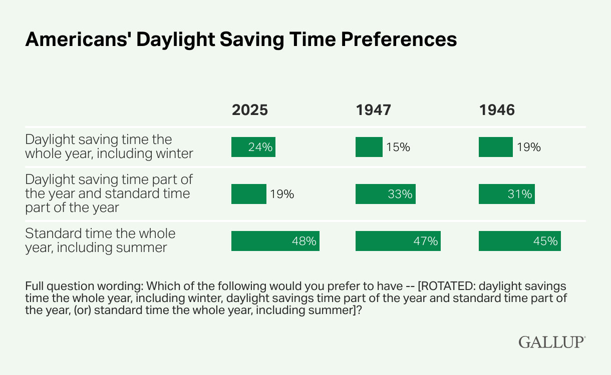 Ironically, Gallup just released a poll showing it’s actually closer to 50–25–20–5 (pST–pDST–status quo–undecided).