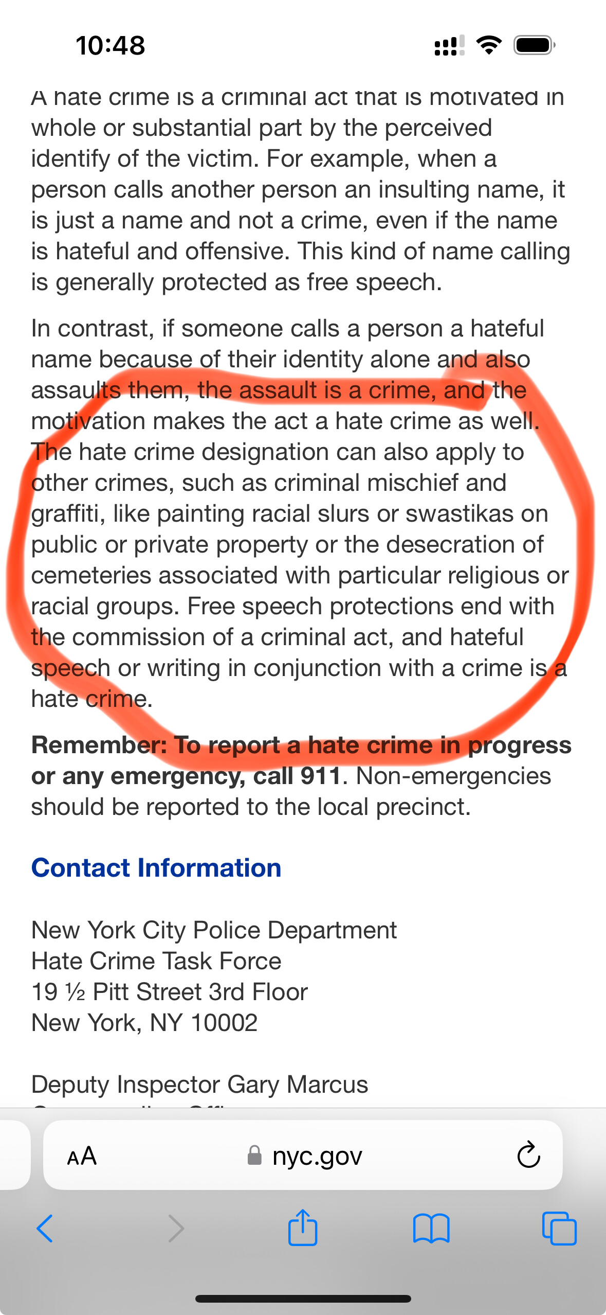 Here is an arrest made by an anti-Israel protester who is charged with threatening a Jewish person in NYC. Also, the hate crime charges extends to Daniel Penny, who is charged with a hate crime simply for protecting the public. So NYC has a vested interest in subjugating certain groups whilst allowing the hate speech and hate crimes (like beating white women and Jewish people without recourse). This is the state of free speech now.