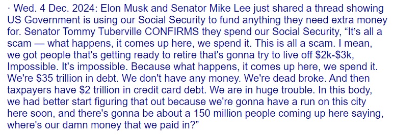 Not sure why there are so many people stuck on the idea of fixing the Social Security shortfall by either pushing out the retirement age or coming up with more tax money from the American People. I read through these posts and it seems almost nobody is addressing the problem head on – by stopping the fraud and government waste instead, which is the VERY SOURCE of the problem. Why is that? Is it because it is too hard to contemplate that one’s own government could be criminally responsible from stealing from the American People? Ask yourself why so few people want to bring up the REAL problem with Social Security. Elon doesn’t have a problem telling the world.