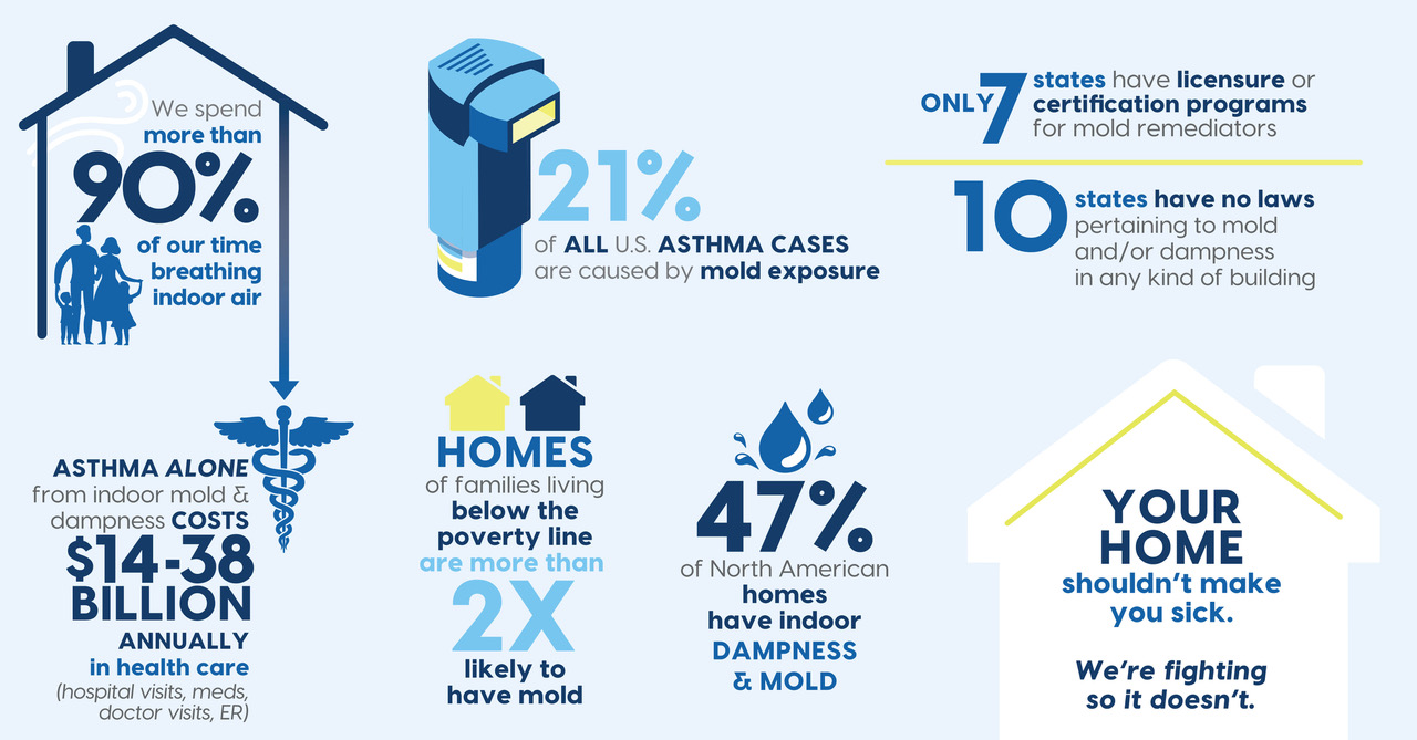 We spend more than 90% of our time breathing indoor air. It is therefore vitally important that our air is healthy, and that health-protective standards for indoor air quality be established and implemented for the benefit of all communities nationwide. The U.S. Centers for Disease Control & Prevention (CDC), U.S. Environmental Protection Agency (EPA), and American Lung Association have determined that mold —along with radon, asbestos, and lead— is a critical indoor air pollutant that adversely affects human health. And yet, there are no health-based standards or thresholds for mold or the conditions that support mold growth (i.e., dampness). Consequently, major public health interventions to reduce or eliminate exposures to indoor dampness and mold have been left to states and local jurisdictions to implement, with marginal results over time.