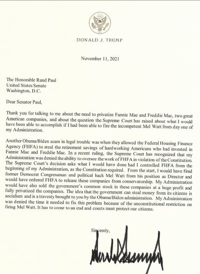 The only rightful outcome of this 16-year saga is to release Fannie Mae and Freddie Mac from conservatorship, cancel the governments senior preferred stock agreement, and cancel their warrants. The government has already been paid back far in excess of what the companies were given by the government, and they are among the most profitable companies in the world. Any outcome other than this is highway robbery, and the United States is better than these 3rd world policies.