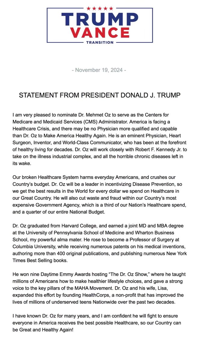 Logically thinking too, President Trump would not have made a deal with RFK, if it did not give RFK everything he was looking to do. (the entire HHS reform and so on). I also feel it is safe to assume that RFK and President Trump spoke to each other about choosing Oz for this department.
